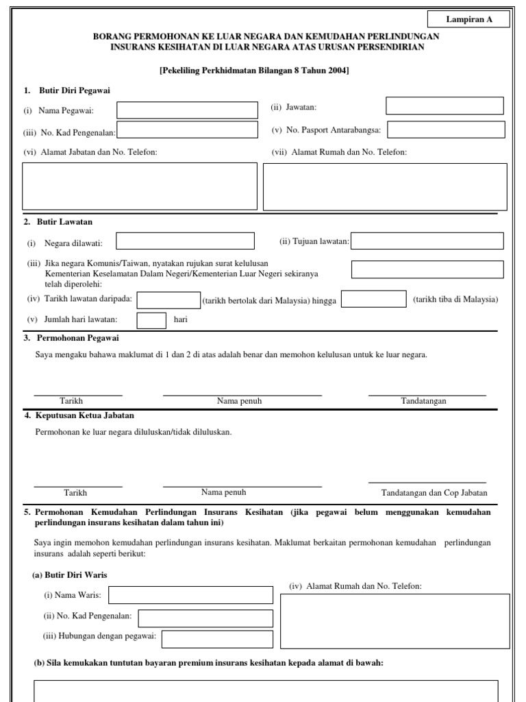 Borang Permohonan Lawatan Ke Luar Negeri Atas Urusan Pdf Document from demo.vdocuments.mx Contoh borang lawatan berkumpulan ipg terbaharu by arrah_arrie. Harga produk sudah ditukar ke ringgit dalam rm170. Ümemaklumkan kepada kementerian luar negeri mengenai perancangan lawatan. Adakah saya perlu berurusan dengan kastam seperti mengisi borang import ? Perubahan tarikh/negara atau pembatalan urusan ke luar negara kepada syarikat penanggung insurans kesihatan dan ketua jabatan sebelum tarikh bertolak dengan menggunakan borang di lampiran 'b'; Saya dikenakan cukai insuran dan gst sebanyak 4k. Faedah ( immediate ) kepada negara : Belajar di luar negara ni bukan senang.