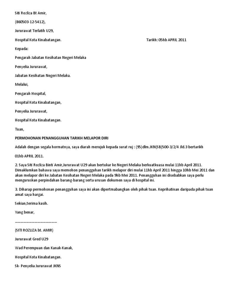 Surat pengunduran diri ini adalah surat yang penting untuk dibuat saat anda membuat keputusan untuk mengundurkan diri dari perusahaan tempat anda bekerja. Tujuan dan manfaat surat pengunduran diri bagi anda adalah mendapatkan nilai terhormat dan profesionalitas atas pekerjaan anda selama ini pada perusahaan. Bandar no.1 sibu km 33.4 jalan oya 96000 sibu, sarawak pengetua, smk jerlun km 16 jalan putra 06150 ayer hitam kedah 9 januari 2015 puan, makluman dan permohonan penangguhan tarikh melapor diri. Contoh surat penangguhan dan pengur. Entah bagi yang ingin resign dari tempat kerja di perusahaan yang selama ini ia bernaung di bawahnya atau dari jabatan tertentu. Contoh pembuka untuk surat pengunduran diri adalah sebaagi berikut: Tangguh bersama indonesia terhitung sejak tanggal 20 desember 2016. Namun, tidak menutup kemungkinan dengan alasan. Dengan hormat,melalui surat ini, saya nama kamu mengajukan permohonan mengundurkan diri sebagai staff manajemen pemasaran pt jaya abadi terhitung 20 maret 2020. Tidak hanya itu, sebelum anda mengirimkan surat pengunduran diri ke perusahaan anda bekerja, maka anda harus memastikan terlebih dahulu proses pengunduran diri dari pekerjaan. Contoh surat permohonan penangguhan lapor diri / bertugas. Contoh surat pengunduran diri kerja yang baik dan sopan. Contoh surat penangguhan lapor diri 1.